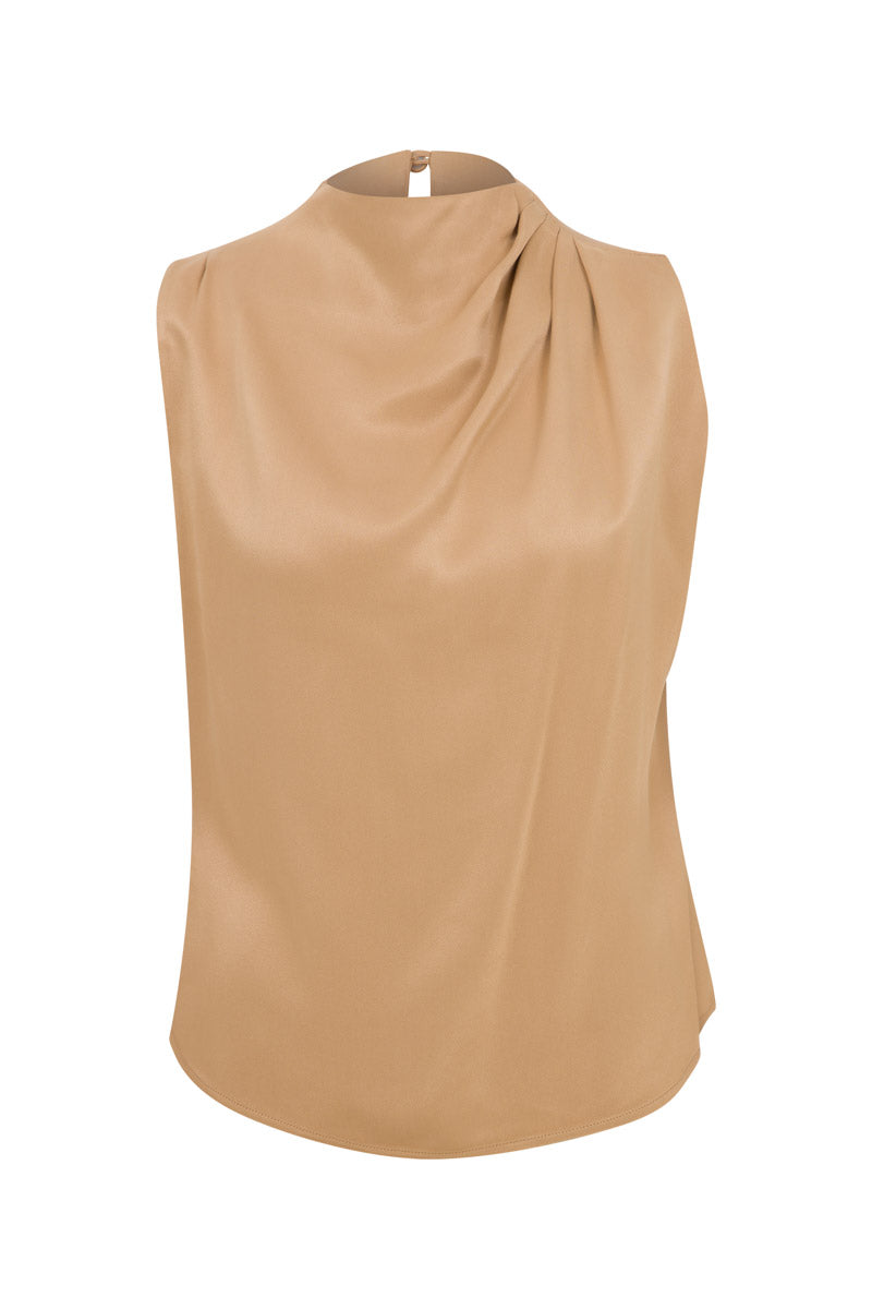 This silky satin draped blouse exudes a sophisticated elegance, perfect for a chic evening look. The high neck and fluid drape enhance its luxurious feel, making it a great choice for formal events or stylish dinners. For a harmonious ensemble, pair it with its matching draped skirt. Alternatively, consider wearing it with tailored trousers and high heels for a refined office outfit. Silky satin fabric