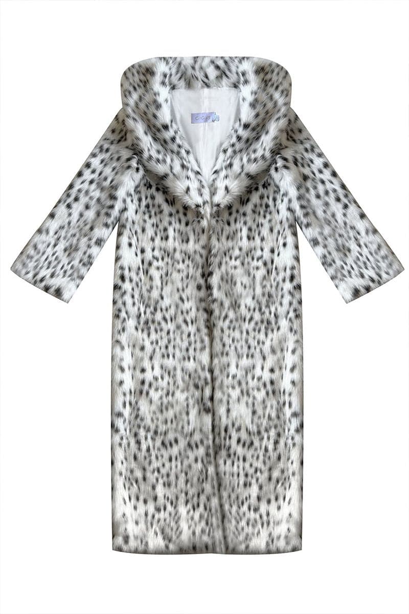 Surround yourself in opulence - this long, vegan fur coat features a full lining and an exquisite, white and black leopard pattern.