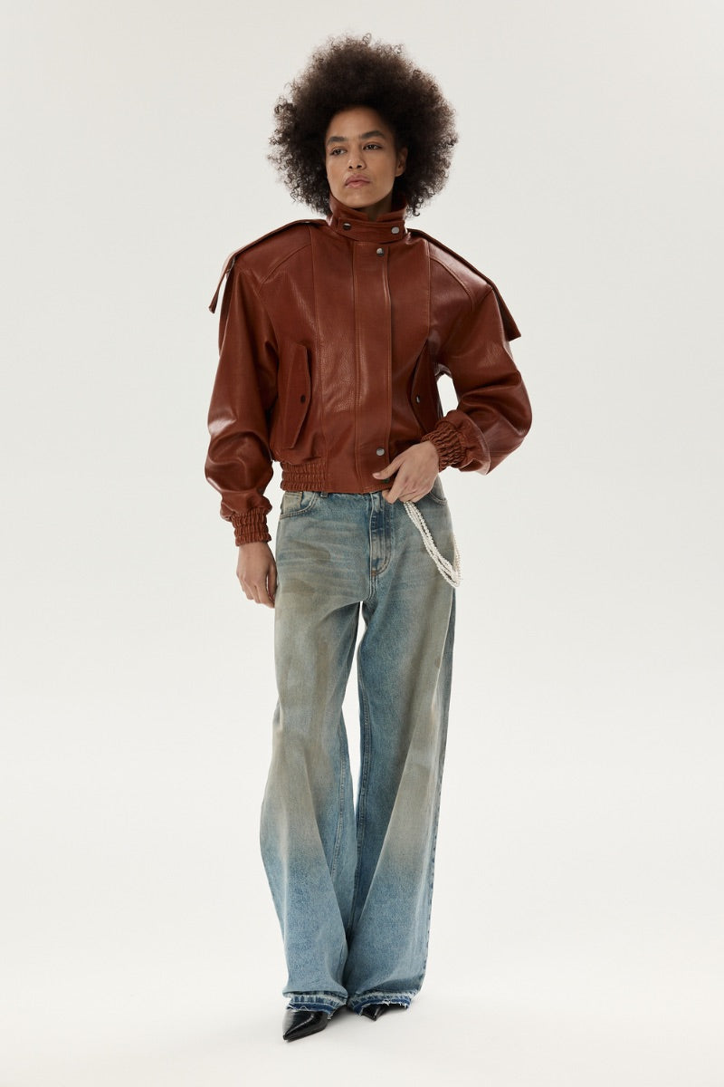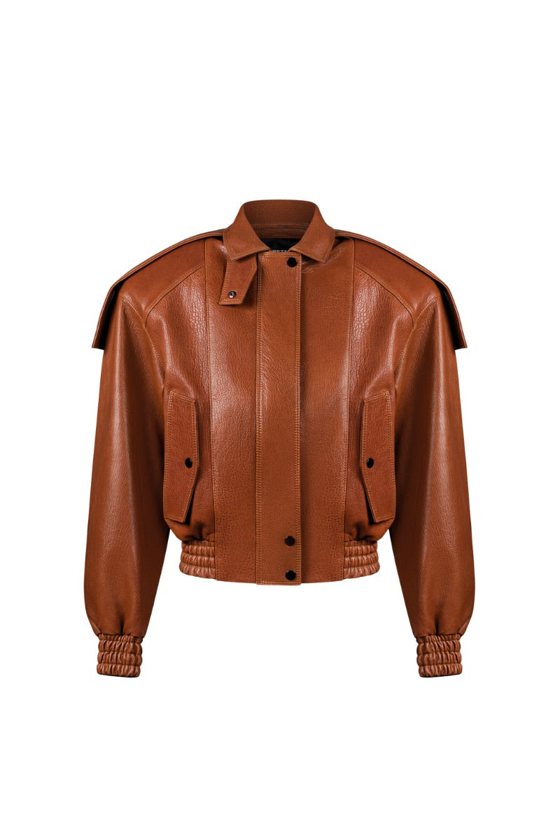 Italian leather bomber jacket with a bold, structured silhouette.