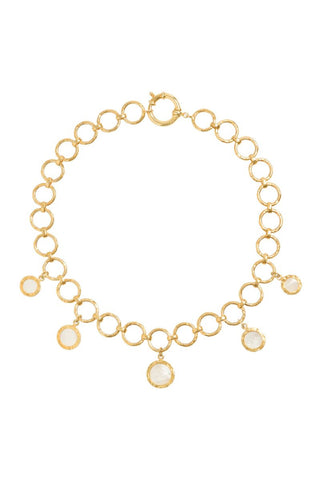 - Elevate your jewellery collection with this stunning 18ct gold-plated brass Forged Circular Necklace, featuring intricately designed Mother of Pearl charms that embody the natural elegance of raw, organic earth forms. Each charm, with its lustrous sheen and rounded shape, brings a delicate yet bold presence to your neckline. The necklace's minimalistic design is balanced by the luxurious materials, creating a sophisticated piece that drapes beautifully.