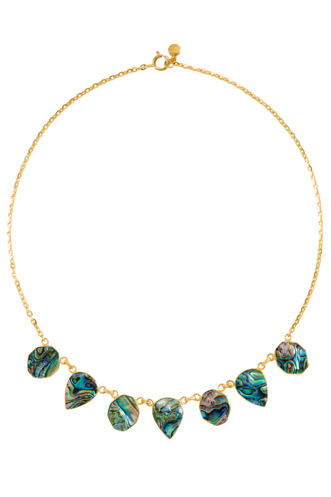 Handcrafted using genuine Paua/Abalone Shell and 18ct Gold Plated Sterling Silver and 18ct Gold Plated Sterling Silver Necklace with 7 Paua/Abalone Shell Pendants.