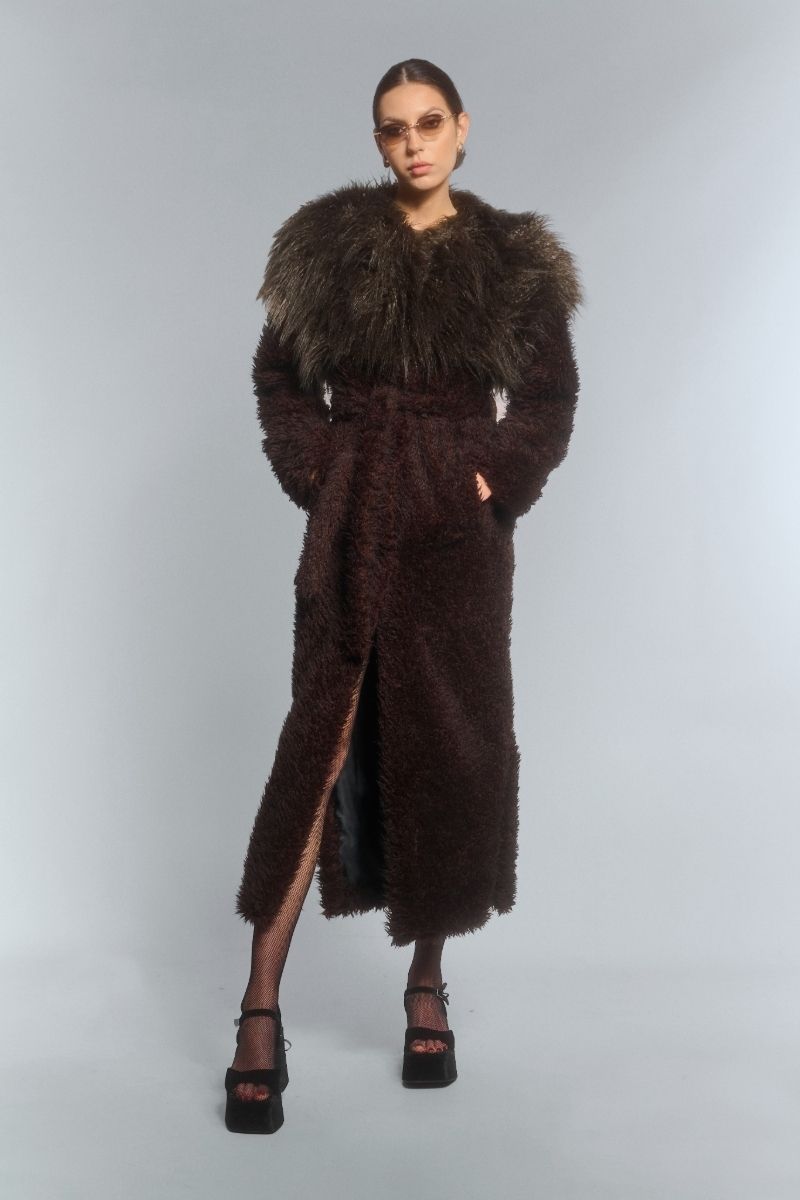 faux fur maxi coat with flared sleeves in brown