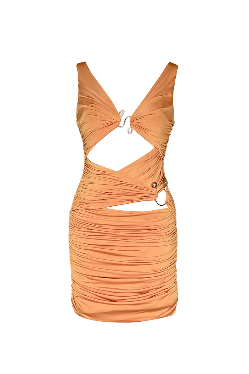 Carry all the sparkle of summer with the Alora Dress! Taking beach chic to a whole new level with its form fitting, bold cuts and draped details, this dress is a candidate to be the favorite of energetic and ambitious women. The elegant ring accessory located in the middle of the chest connects the two collar pieces, while the cut-out details on the belly and waist emphasize your femininity. Alora, which highlights the legs thanks to its micro length, offers a wide range of use from the seaside to summer parties.