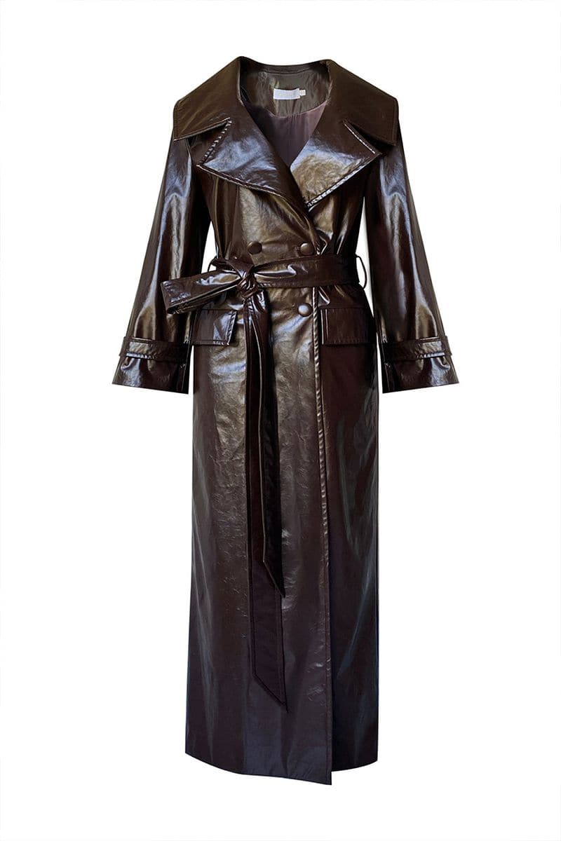 Crafted from sumptuous vegan patent leather, this GABRIELLE faux leather trench coat is adorned with a waist-cinching belt, exuding an elegant, tasteful touch.