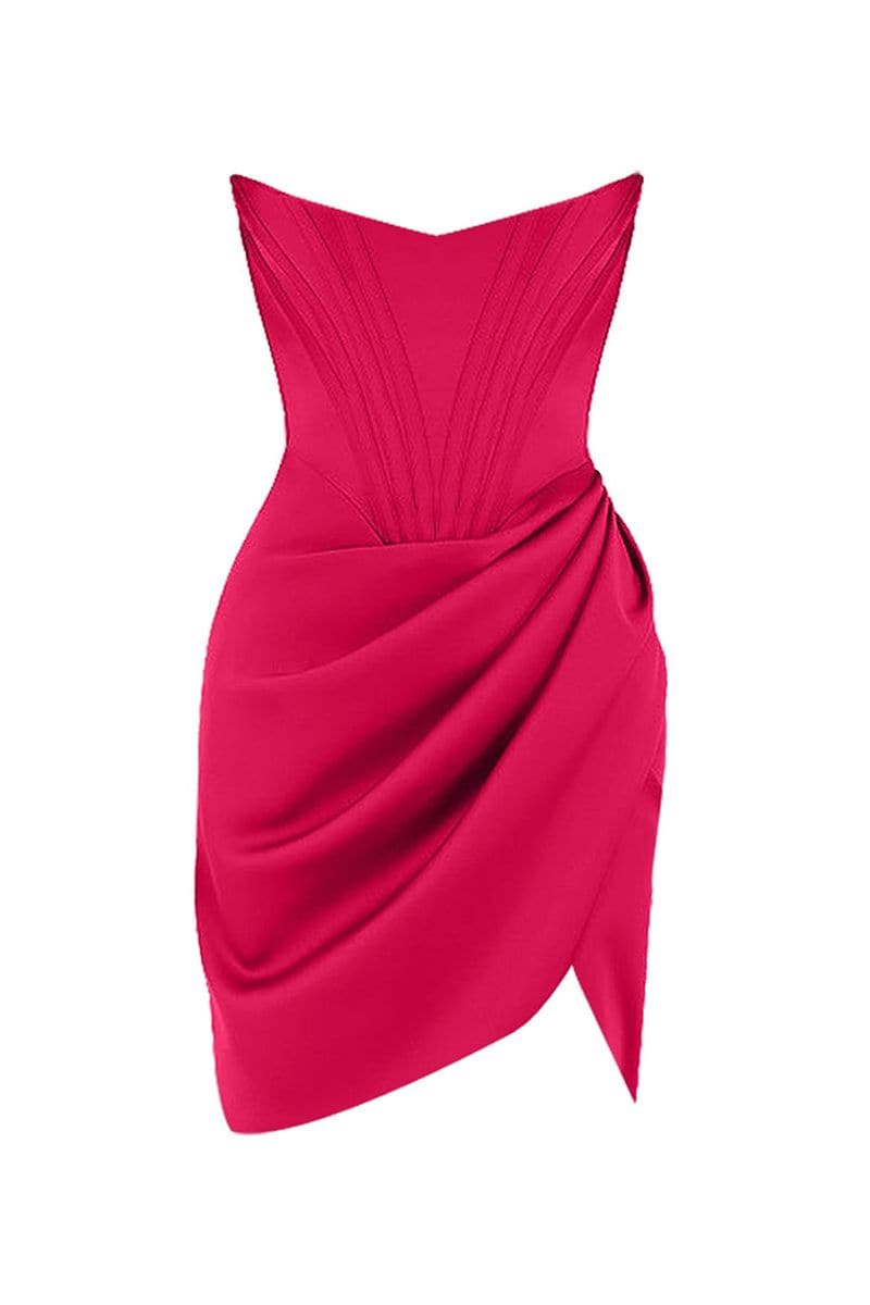 Crafted from delicate jasmine pink satin, this mini dress is designed with underwiring; lined with a double-breasted front slit.