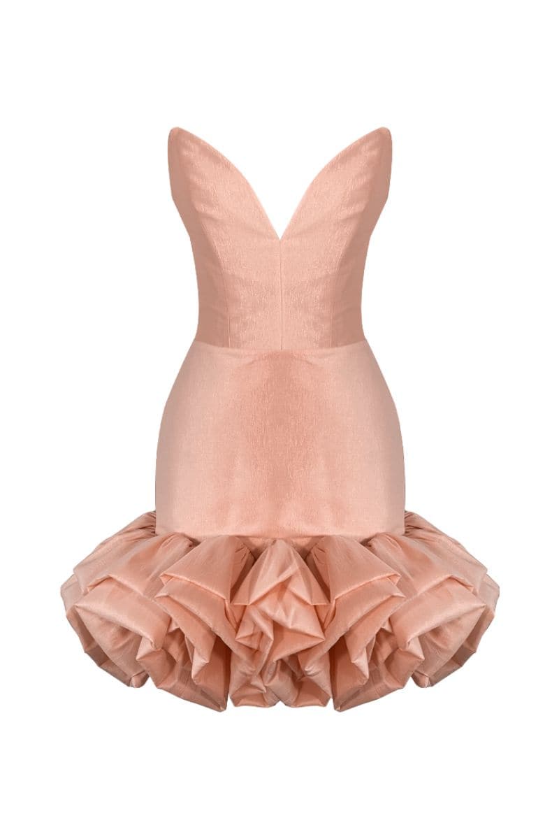 This exquisite SWAN LIGHT PINK MINI DRESS is crafted with a deep v-neck, frilled skirt, and taffetta fabric, making it the perfect choice for your next evening event.