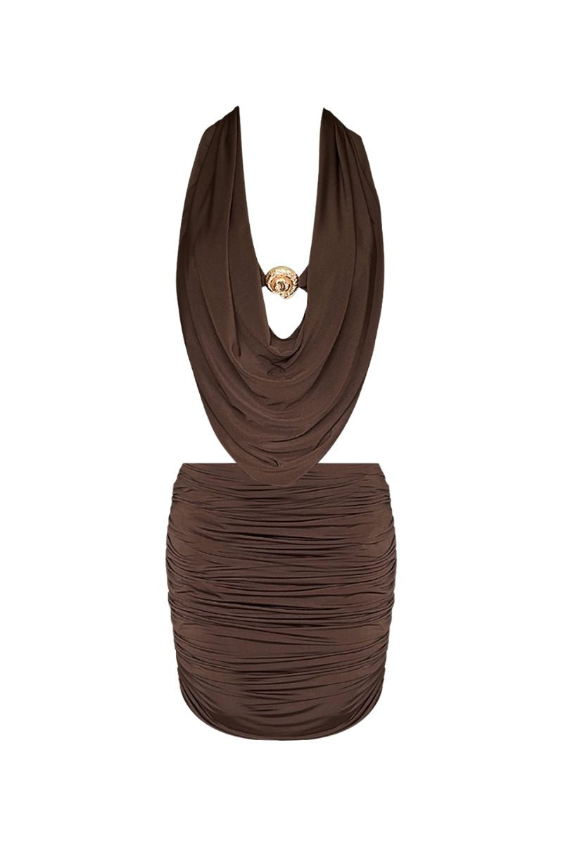 - Deep neckline and draped front design
