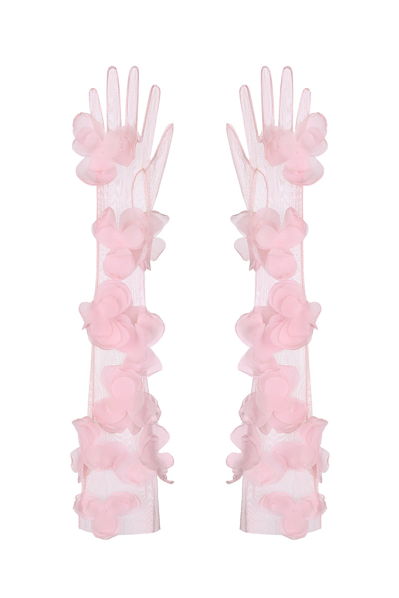 Martina Gloves are crafted from soft tulle and decorated with 3D trefoil organza flowers, creating an elegant and delicate look with its elbow-length design. They come in a one-size fit.