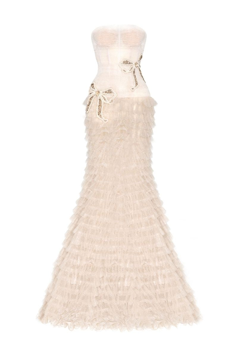 ivory bow tie beaded gown