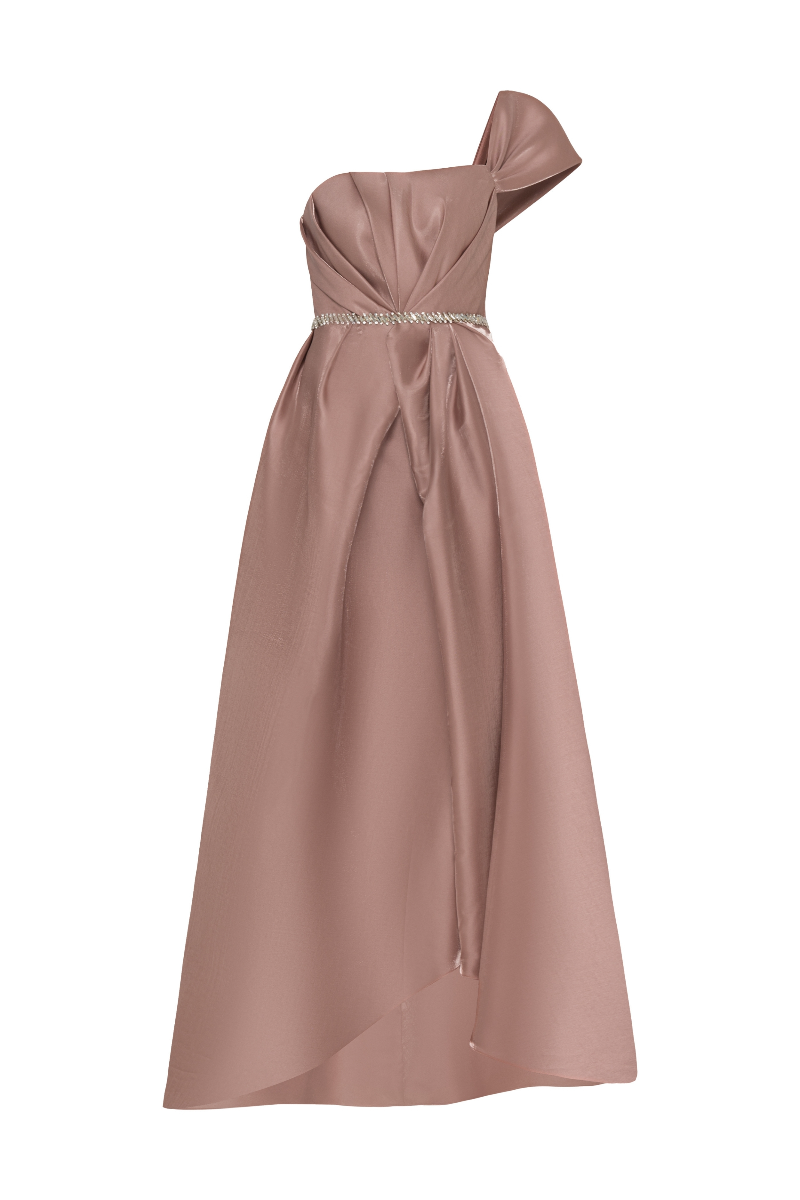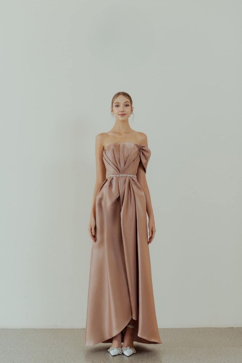 Glamorous off-shoulder design with a regal princess silhouette, accented by intricate beading and a hidden side zipper, all expertly crafted by hand in Vietnam.