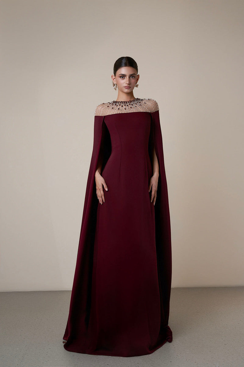 - Floor-length gown with built-in cape sleeves