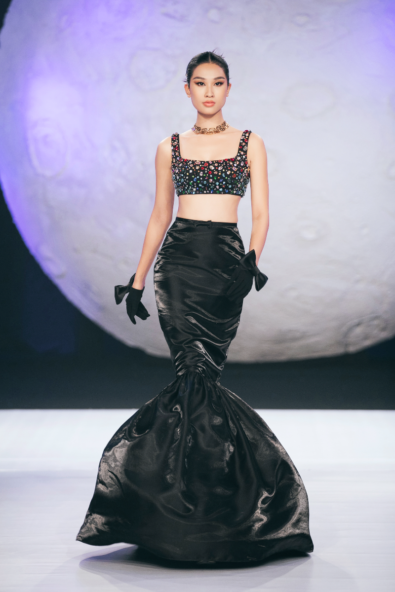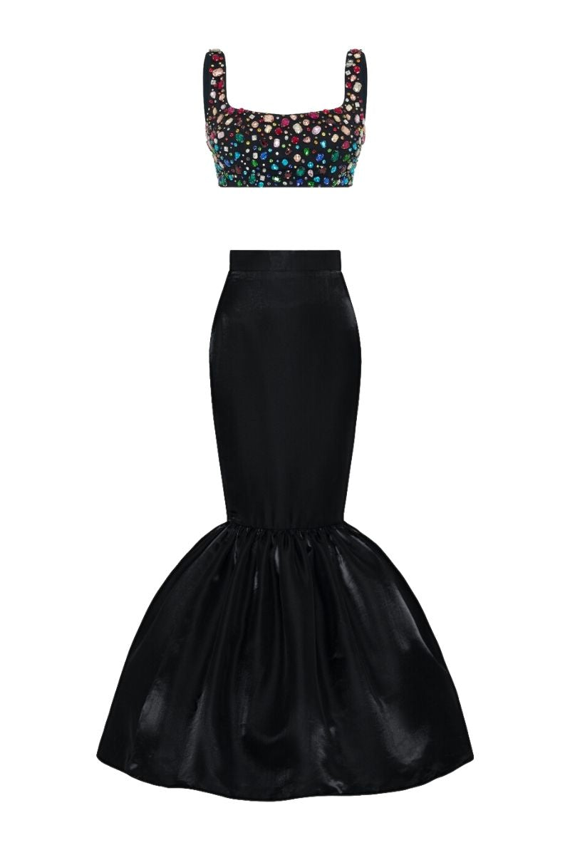 Exude luxury with our handmade rhinestone top and silk taffeta mermaid skirt set, featuring a mini top and zipper detail, all expertly crafted in Vietnam.