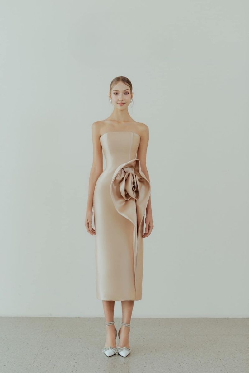 Handmade in Vietnam, this luxurious bandeau dress features a pencil silhouette and an invisible zipper down the side for a sleek and elegant look. Adorned with a 3D flower detail, this dress is perfect for any upscale occasion.