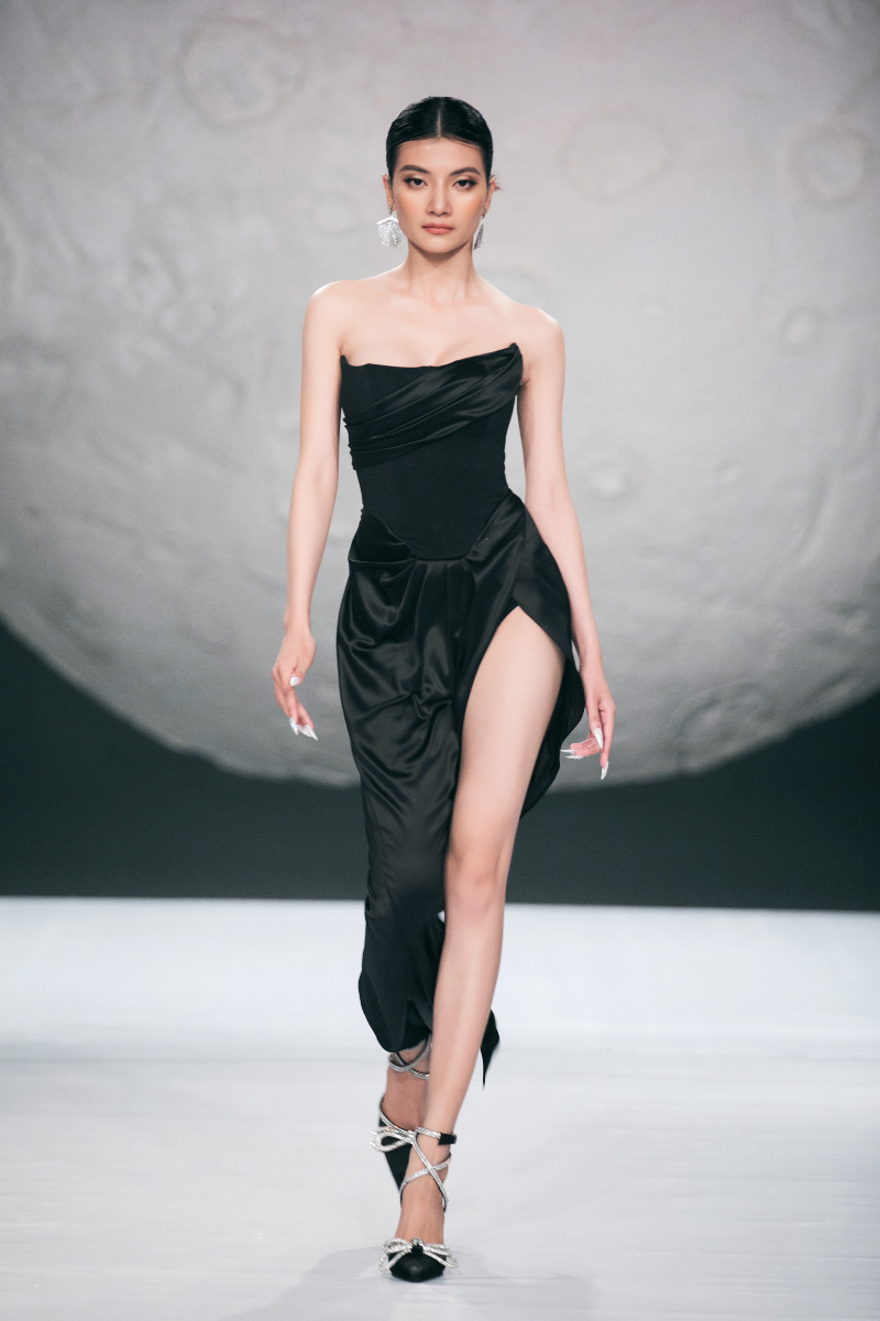 This gorgeous dress features a slit, bandeau-style top, and corset design, all crafted from luxurious silk and handmade in Vietnam.