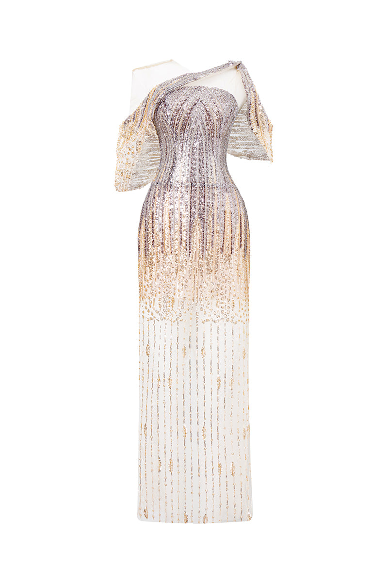stephanie sparkle illusion falling dress in light gold