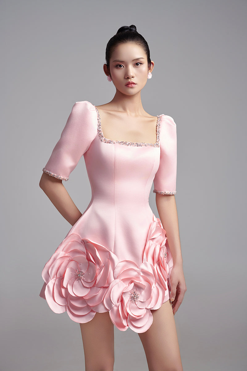 3d floral square neckline silk taffeta mini dress