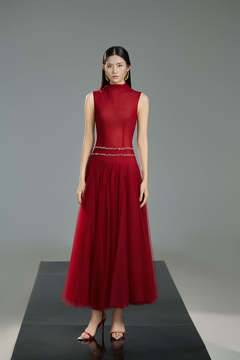 high neck organza a line midi dress in red