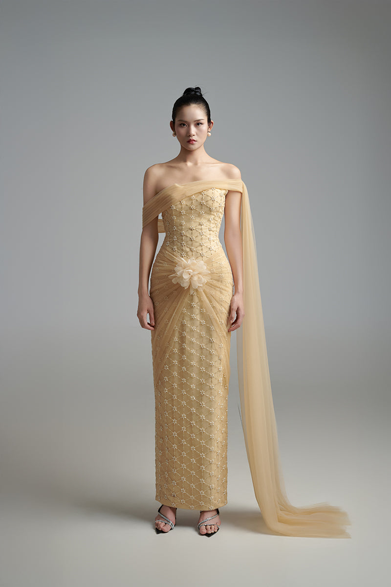 light tan crystal maxi dress