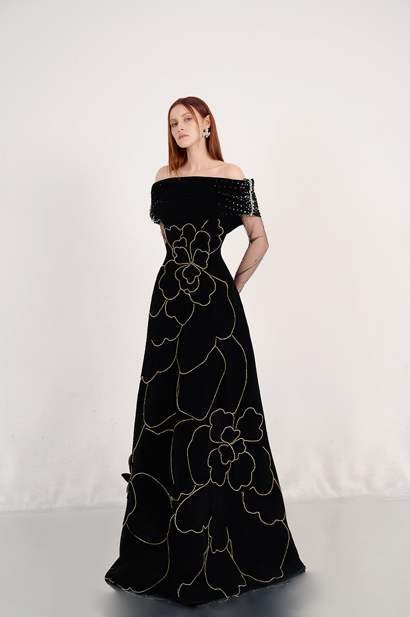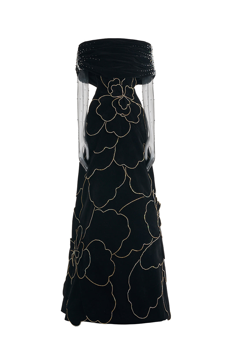 off-shoulder velvet maxi dress with floral details
