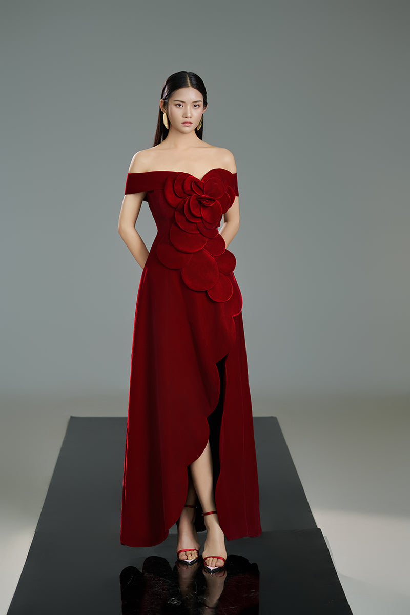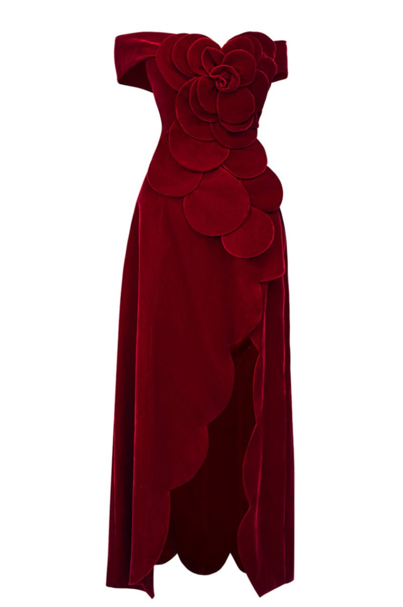 off-shoulder velvet petal maxi dress in red