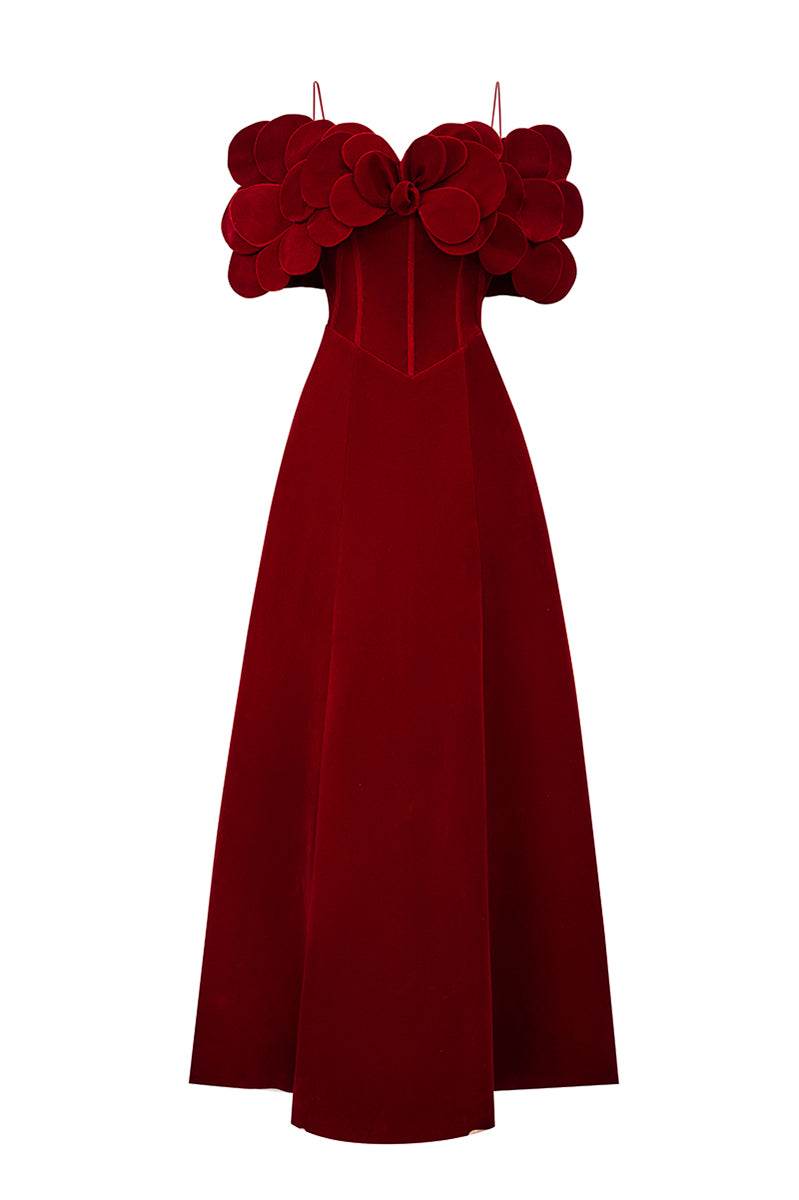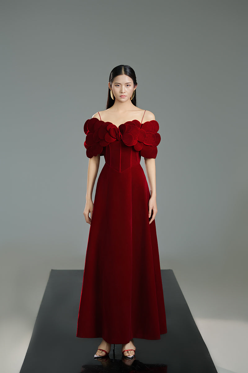 Made from premium velvet with petal neckline, this dress exudes sophistication and exclusivity. The cold shoulder sleeves add a modern touch to the classic trumpet silhouette, making this the perfect choice for a glamorous evening out.