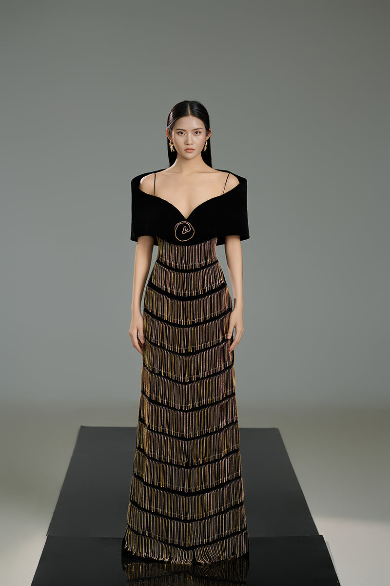 This luxurious dress features off shoulder design and a stunning velvet fabric adorned with layered Stones. Perfect for any formal event, this dress will make you feel like a true fashion icon.