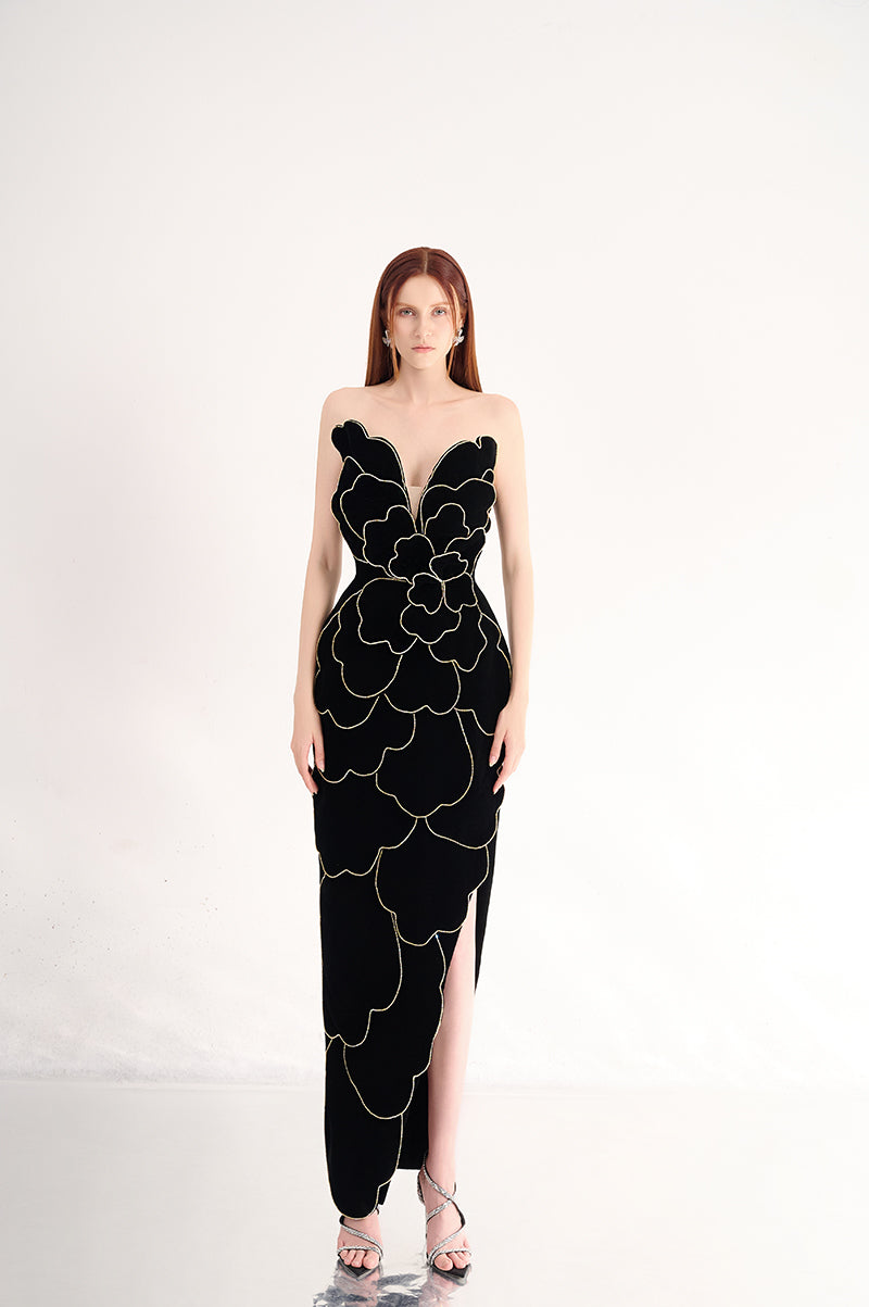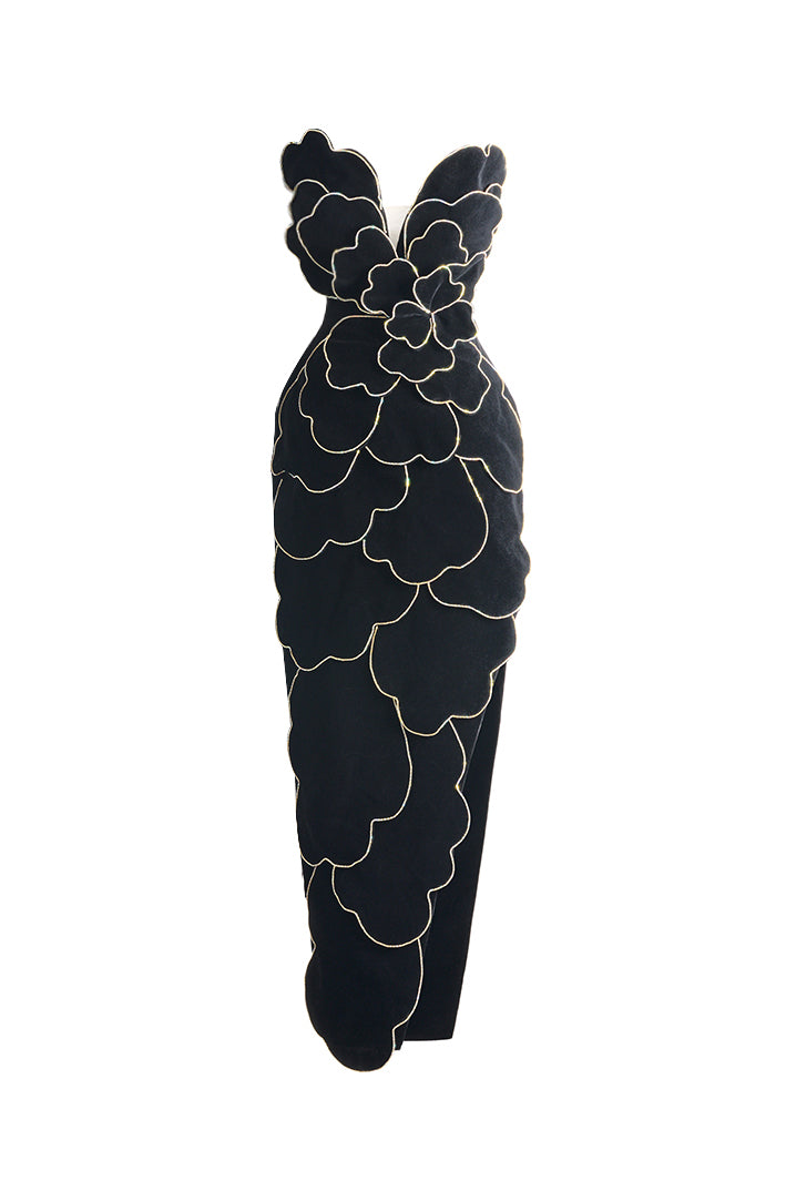 velvet v-neck petal strapless maxi dress in black