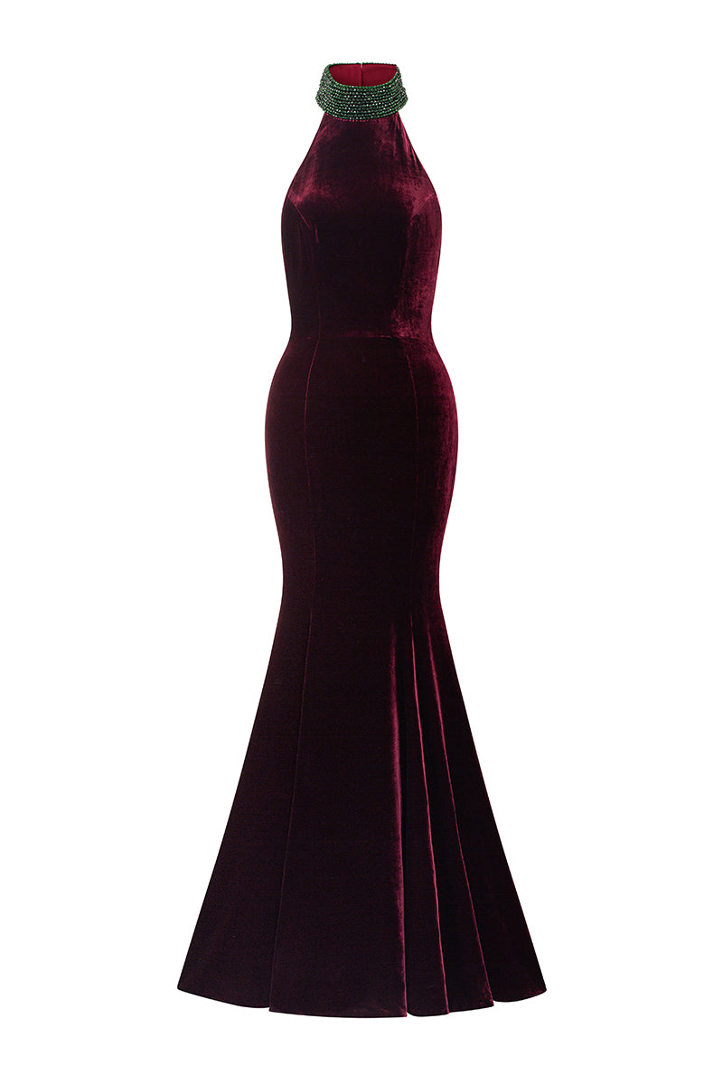 This mermaid gown, crafted from luxurious Silk Velvet, is a striking fusion of sophistication and dramatic allure. The halter neck with a stand collar adds a regal touch, while the open back cut-out detail introduces a hint of modern boldness. The cape sleeves flow gracefully, creating a sense of ethereal movement. The stand collar, meticulously embellished with crystals in varying colors, provides a radiant focal point, adding opulence and refinement. This gown is the epitome of timeless glamour, perfect for a memorable evening where elegance and modernity converge.