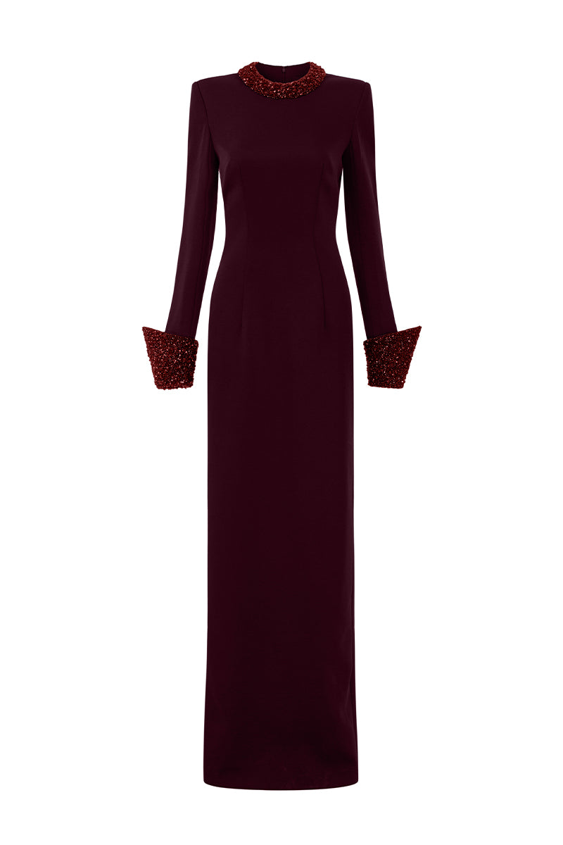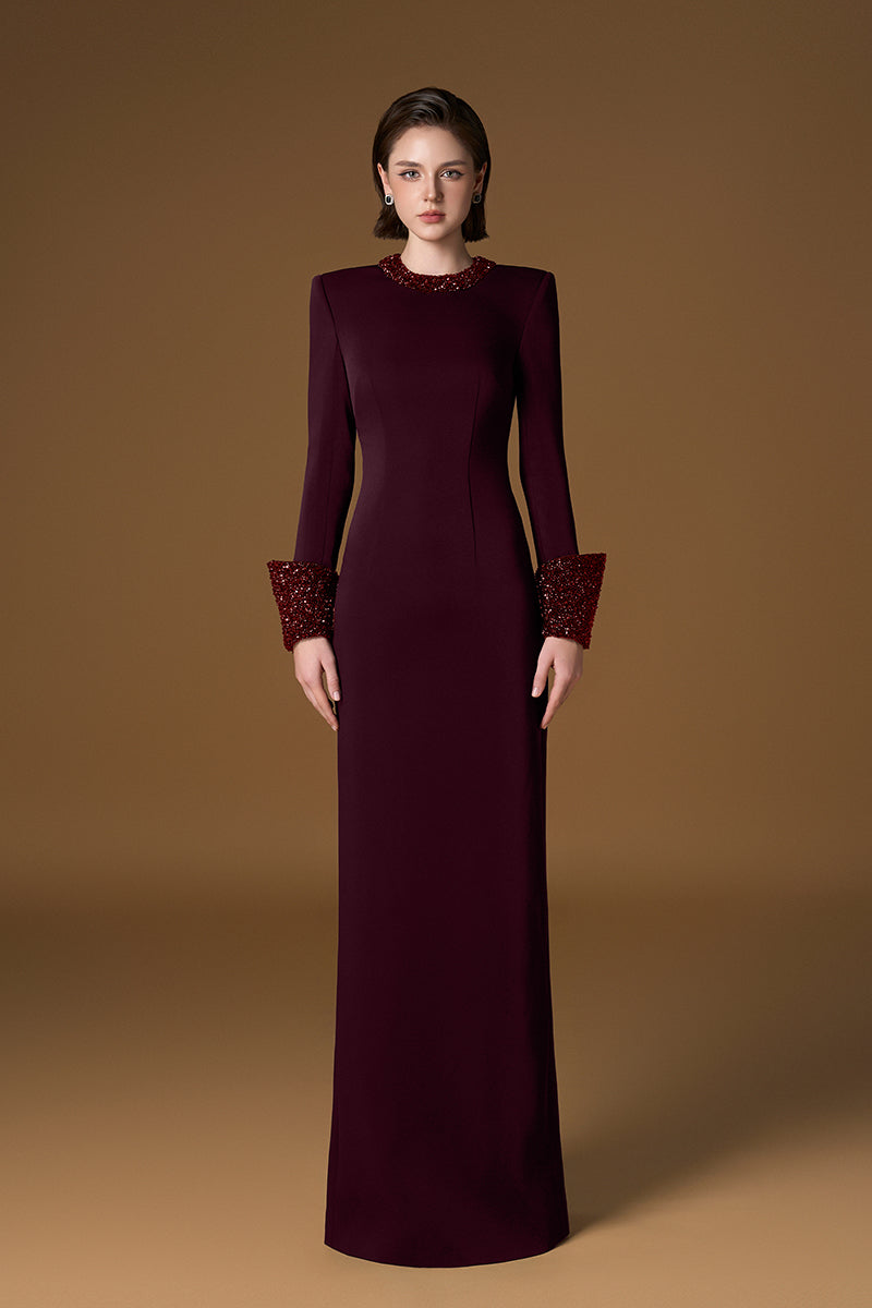 The Column Gown in Crepe embodies understated luxury and refined power. Designed with a round neckline and long sleeves, the gown contours the body with clean precision. Subtle embellishments of stones and crystals adorn the neckline and turn-up cuffs, adding a whisper of radiance to the timeless black silhouette - a vision of modern poise and classic grace.