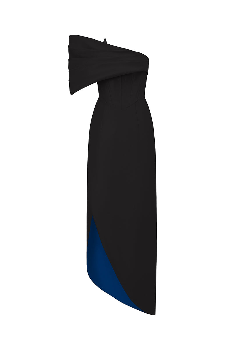 With a mysterious deep black complemented by bold cobalt accents, this gown embodies modernity and bold sophistication. The bustier bodice is elegantly cinched at the waist, paired with an asymmetrical draped off-shoulder detail that accentuates the wearer’s unique charm and grace. The mullet-style wrap skirt reveals a striking green lining, adding an unexpected touch of vibrancy with every movement. This design is the perfect choice for women who want to captivate attention with their distinctive and refined style.