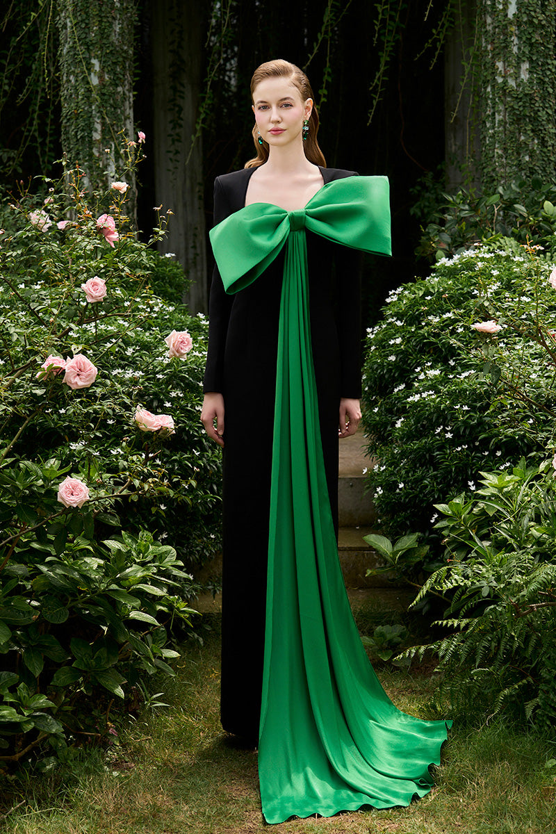 Exuding timeless elegance, this design merges a classic silhouette with a modern twist, featuring a large, vibrant green bow – a trending icon in contemporary fashion. The bow cascades gracefully down the gown, adding fluidity and charm to every step. The softly fitted, longline design enhances a slender figure, showcasing a delicate blend of vintage sophistication and modern style, radiating confident allure and a refined, fashion-forward aesthetic.