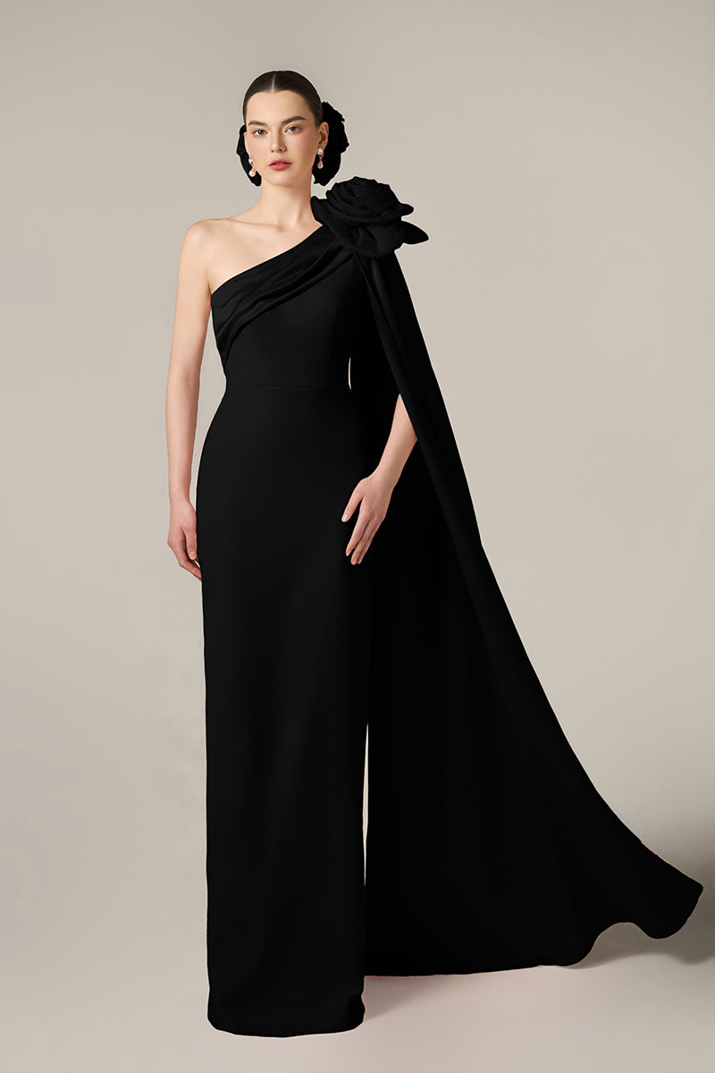 This stunning floor-length column one-shoulder gown, crafted from luxurious Crepe, is a perfect fusion of modern elegance and dramatic flair. The asymmetric cape sleeve cascades gracefully, while the oblique pleated Silk Taffeta train, attached along the neckline, creates a striking visual effect. The gown is further accentuated by an exaggerated rose on the shoulder, adding a bold yet sophisticated touch. This piece embodies timeless beauty, designed to leave a lasting impression at any formal occasion.