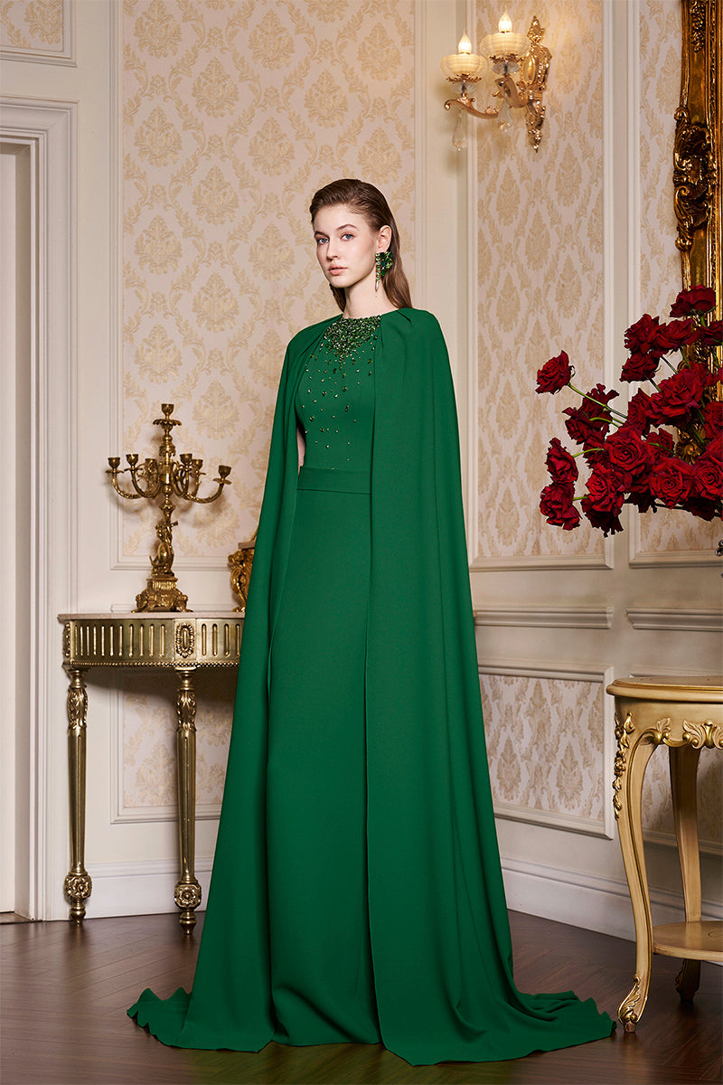 Gown with pleated cape, round neckline with stones, and belt, comes with recycled silk material.