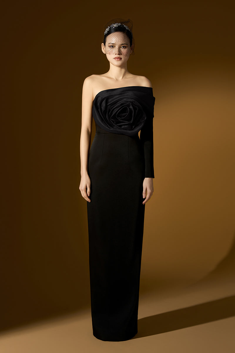 This Asymmetric Floor-Length Strapless Off-Shoulder Column Gown exudes bold elegance and modern sophistication. The gown features a dramatic long sleeve on one side, creating a striking asymmetry, while the exaggerated hand-draped rose in Taffeta on the bustier adds a sculptural, artistic element. Crafted from luxurious Crepe, this gown hugs the body with grace and structure, making a statement of refinement and timeless beauty. Perfect for those seeking to stand out with elegance and flair.