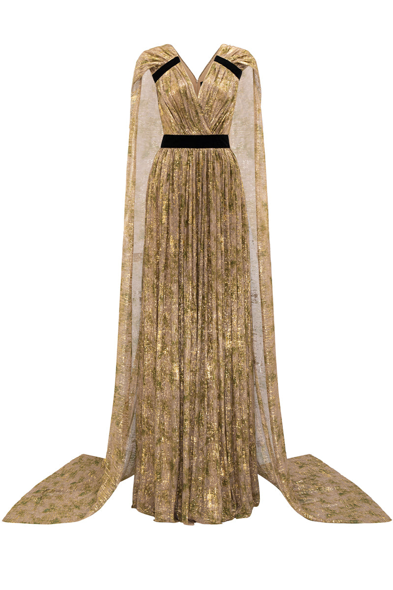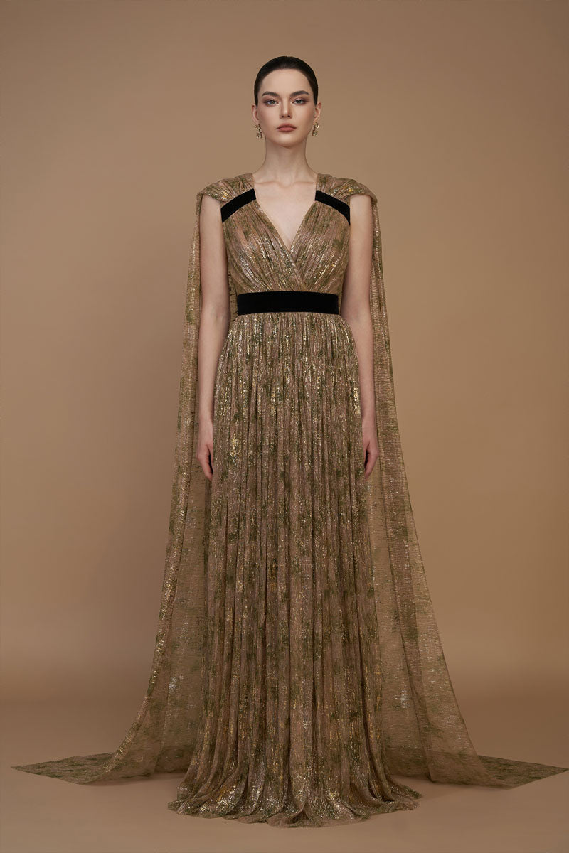 This V-Neck A-Line Gown with Ruffle Back Train is a poetic blend of movement and luminosity. Cut in a timeless A-line silhouette, the design flows effortlessly in green tie-dyed golden chiffon - a fabric that catches the light with every step. The plunging V-neckline and sleeveless bodice strike a balance between fluidity and structure, while the cascading ruffle back train adds a touch of theatrical romance. Finished with an invisible back zipper for a seamless fit, this gown is crafted for women who dress with both boldness and grace.