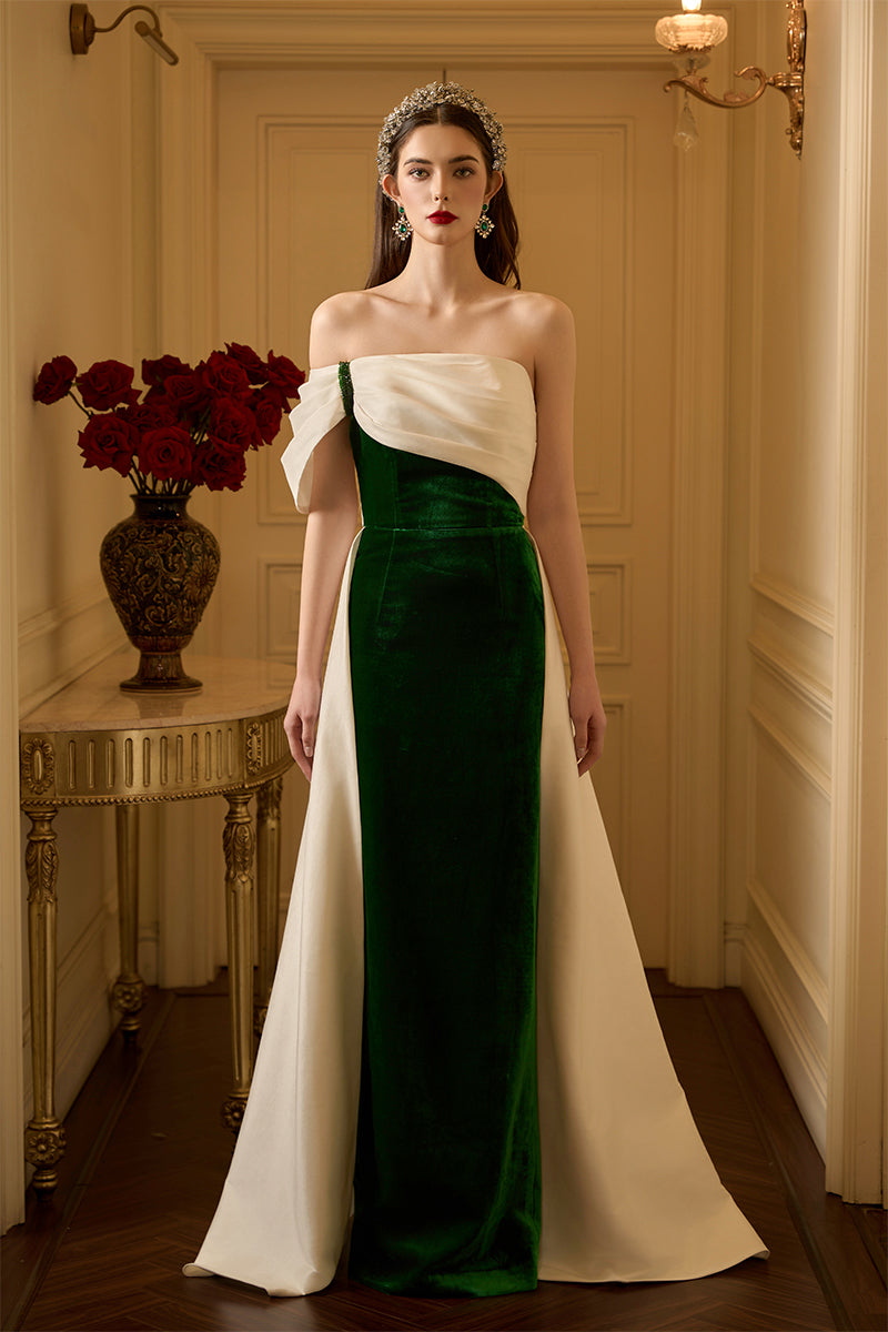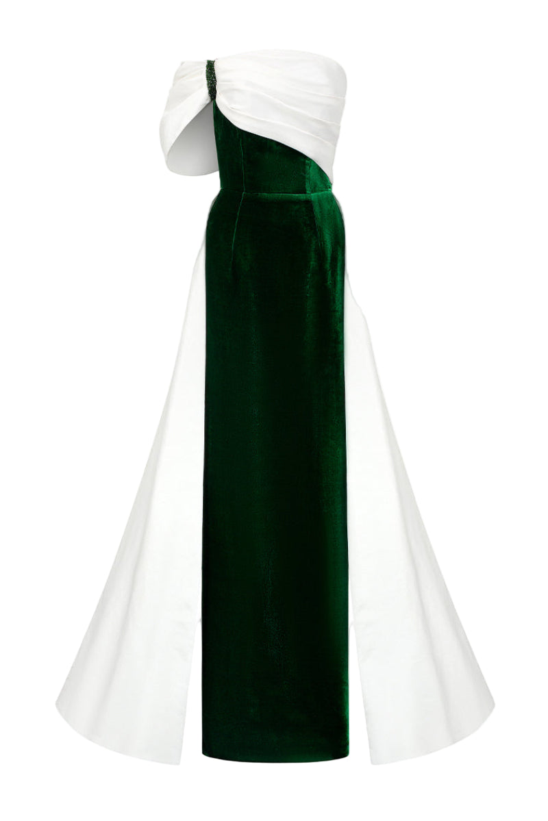 This floor-length bustier column gown, crafted from Silk Velvet and Taffeta, combines luxury with elegance. The strapless design is complemented by an asymmetrical off-shoulder pleated sleeve, creating a strikingly modern silhouette. The draped bodice flows gracefully into a back train, adding an air of sophistication and fluidity. A bold contrast of white Taffeta and rich green Velvet creates an eye-catching visual, while crystals delicately embellish the armscye and shoulder detail, infusing the gown with a touch of opulence. This gown is a perfect embodiment of timeless glamour and refined charm, ideal for any unforgettable evening.