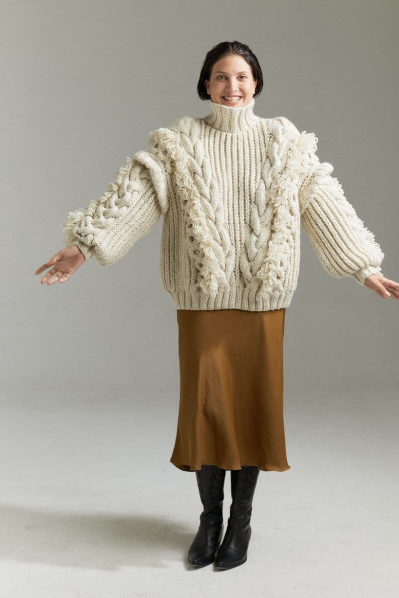 A luxurious turtleneck sweater boasting an intricate fisherman rib and cable design, complete with delightful fringe details - this oversized, comfortable piece is handcrafted with exquisite care in Peru from supremely soft premium merino wool.