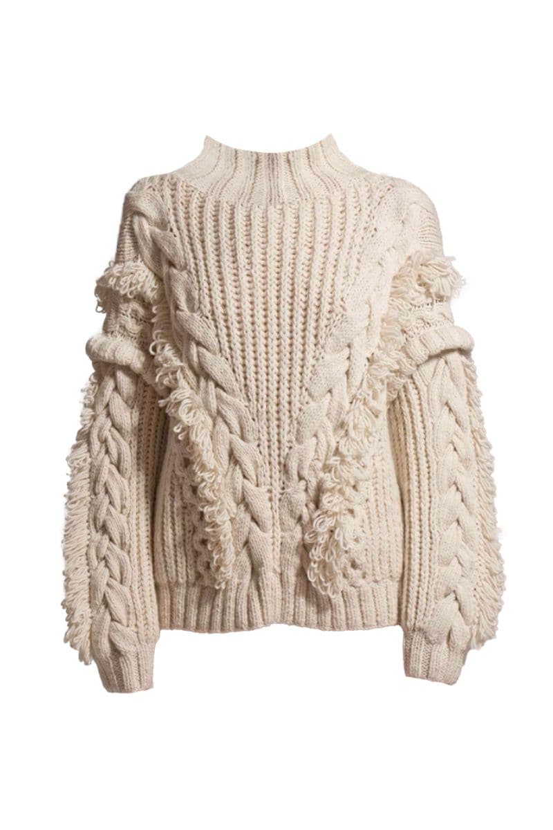 - Intricate fisherman rib and cable design turtleneck sweater with fringe details