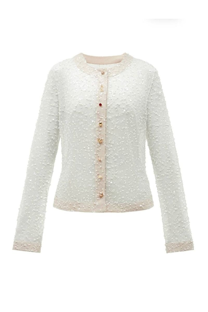 The transparent cardigan, made of fabric embroidered with beads, glass beads and sequins, impresses with its exquisite shine and lightness. The clasp is decorated with the brand's characteristic combination of various buttons, which has become its recognizable DNA. The original design of this cardigan adds uniqueness and elegance to the image, making it an ideal choice for festive events.