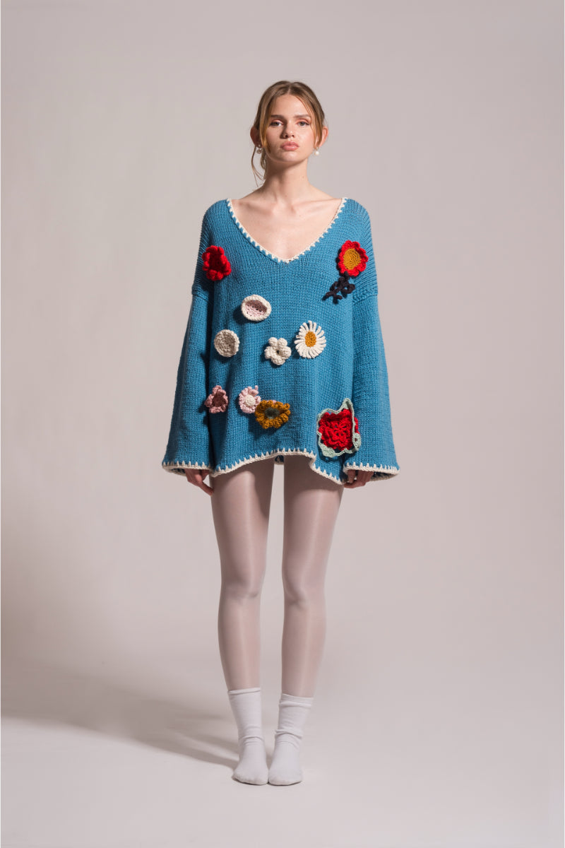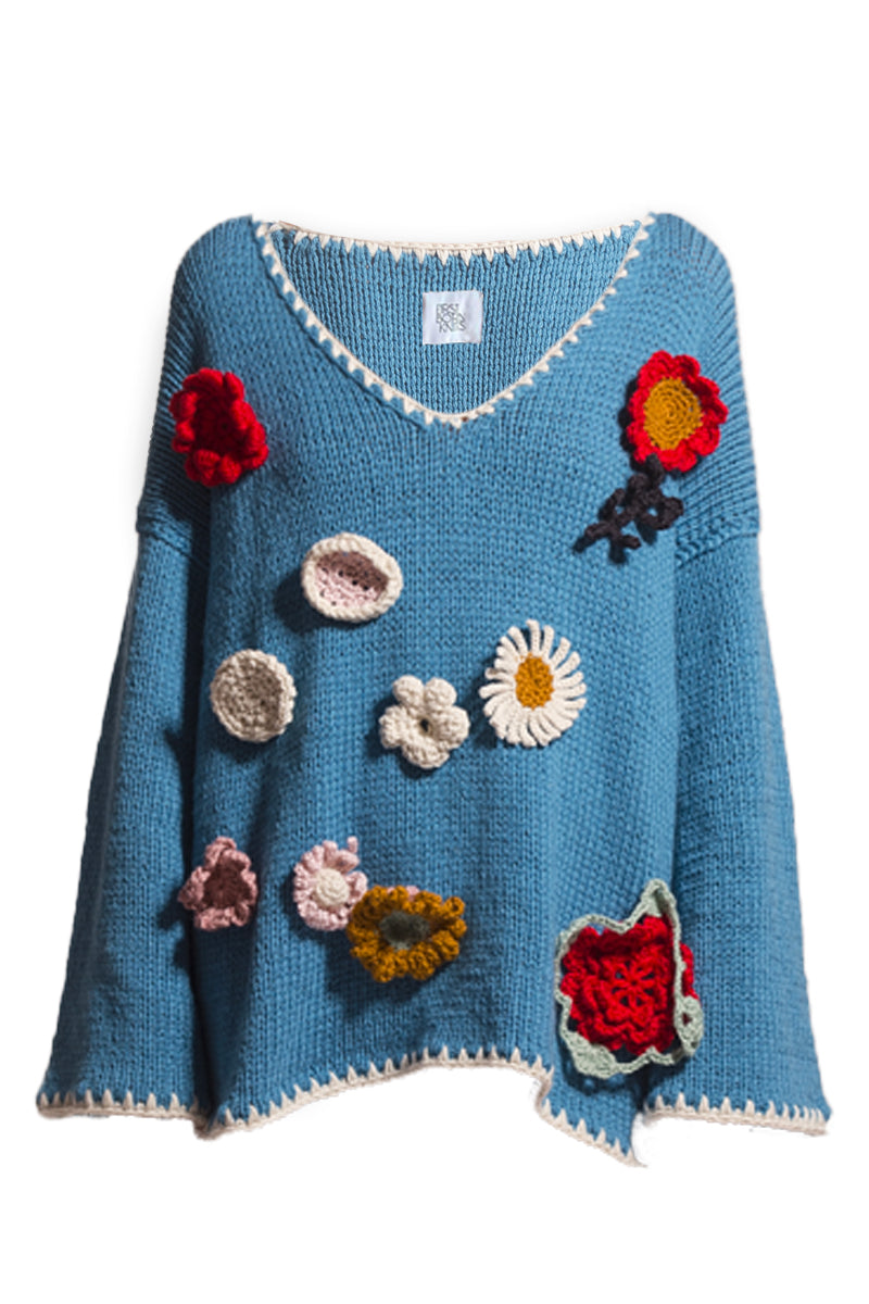 -Hand Crochet flowers indivially placed and hand sewn onto the sweater.