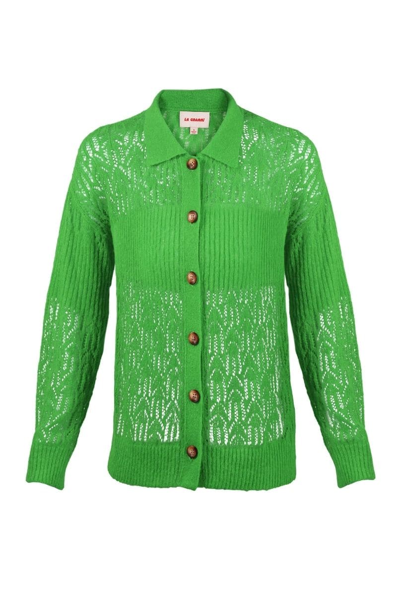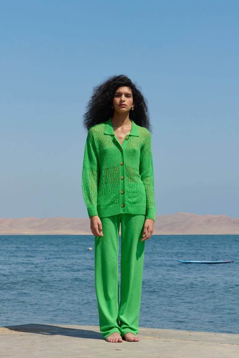 Discover the GREEN ARAÑITA COLLARED CARDIGAN, a timelessly elegant piece perfect for any special occasion. Crafted with a pereline pattern and ribbed detail on the body and arms, this collared cardigan is buttoned for a sophisticated look and a remarkably light feel. A wardrobe essential for the refined individual.