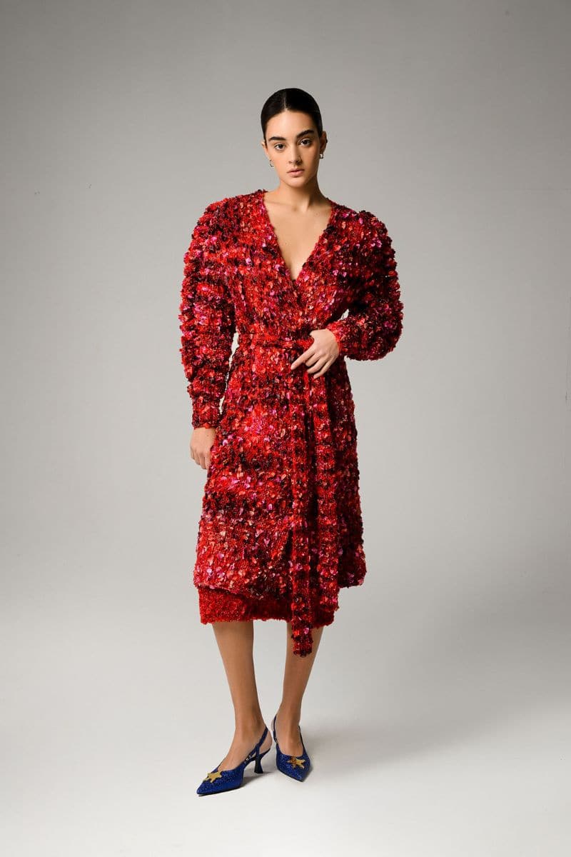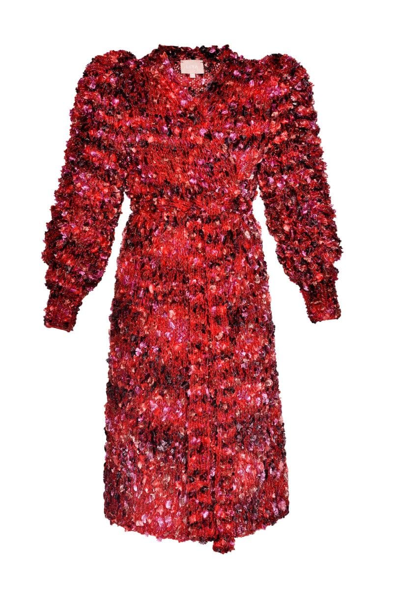 A unique blend of comfort and style. Adorned with LIYA's signature statement sleeves, this piece is crafted from vibrant red-hued yarn, creating a pop of color in your wardrobe. Complete with a matching belt, it's the perfect outer layer to keep you warm and chic on chilly days.