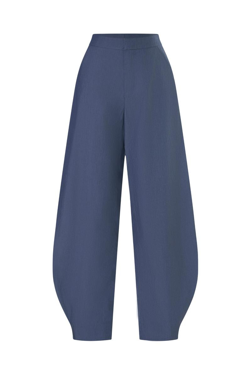 The pants shows modern tailoring with a hint of avant-garde flair, emphasizing silhouette and structure while maintaining elegance and wearability. The trousers are wide-legged and slightly balloon-shaped toward the bottom, tapering inward subtly at the ankles. The fabric matches the top, creating a monochromatic look in a muted slate blue or charcoal tone, which adds to the modern and refined appearance. The overall design has a minimalist yet architectural aesthetic, highlighting clean lines and form.