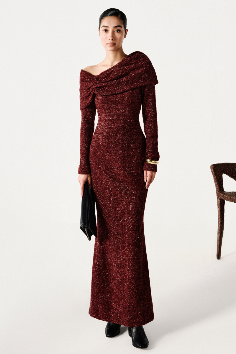 Draping technique that accentuates the waist and a mermaid silhouette. With its structured shape and graceful curves, it adds a playful touch to the soft tailoring aesthetic.