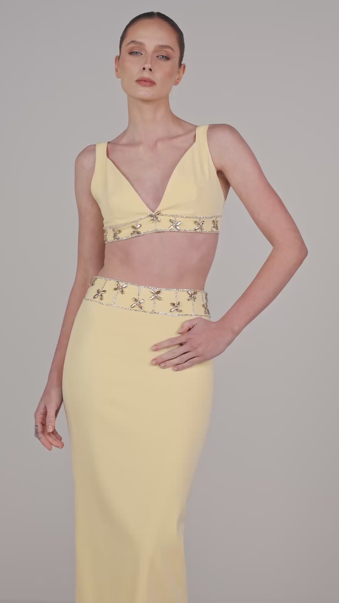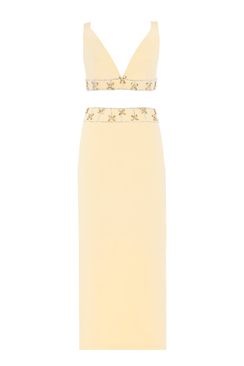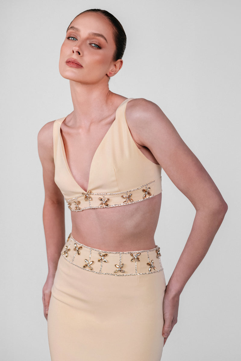 - Hand-embellished detailing on top and waistband