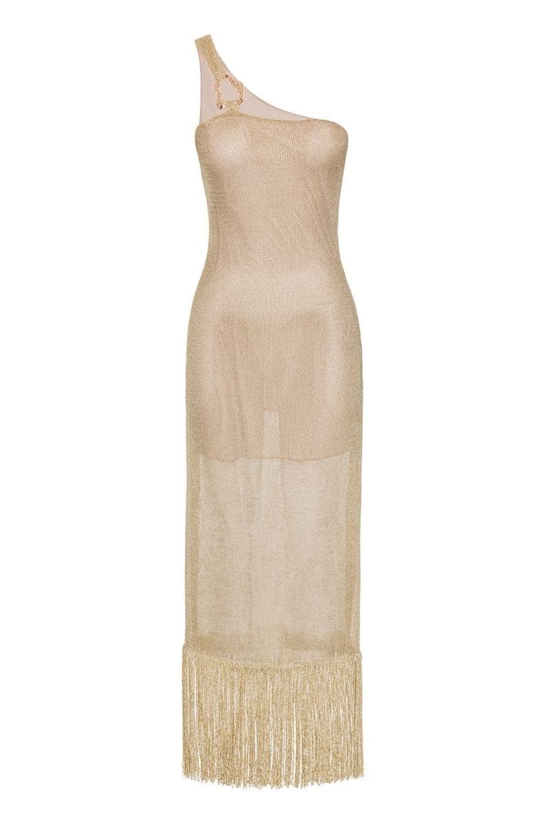 - One-shoulder fringed golden mesh midi-dress