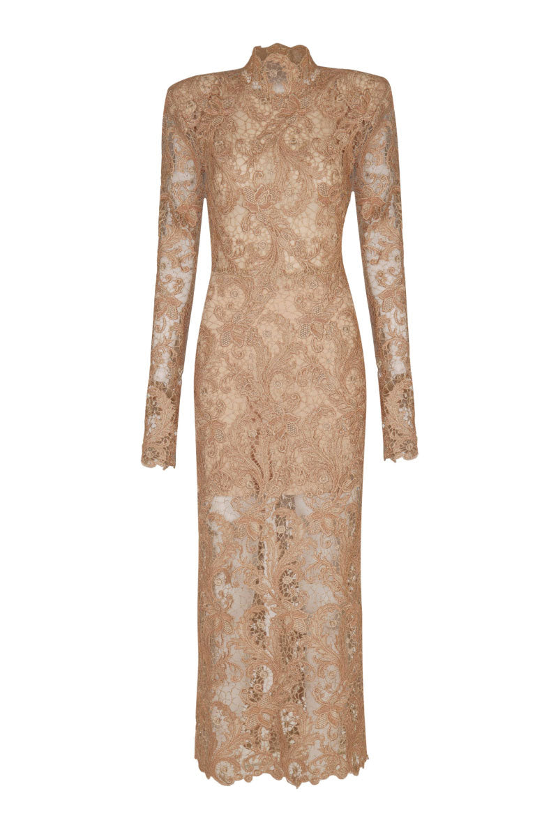 The Lia Dress embodies timeless sophistication with a modern edge. Crafted from intricate beige lace layered over a tonal lining, it reveals delicate artistry while maintaining a refined silhouette. The high neckline and structured shoulders create a strong, sculpted frame. Meanwhile, the fitted bodice enhances the waist and flows into a slim midi skirt that elongates the figure. A subtle back slit adds movement and balance to the design. Romantic yet powerful, Lia is designed for elegant evenings, formal celebrations, and statement-making occasions.