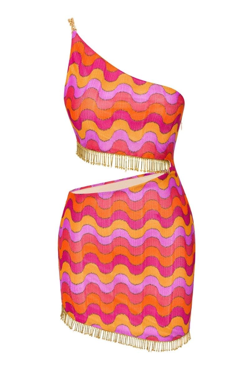 - One-shoulder cut-out knitwear mini-dress with beaded fringe