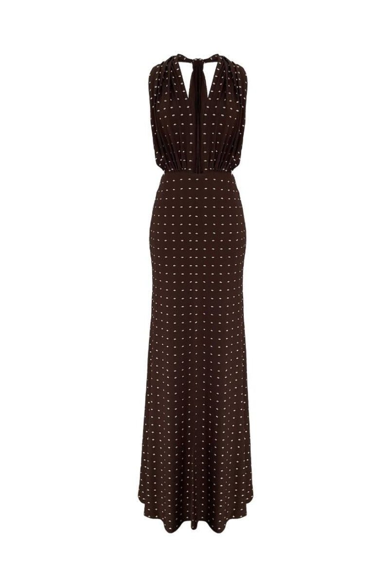 -Long halter-neck dress crafted from premium dark brown stretch jersey