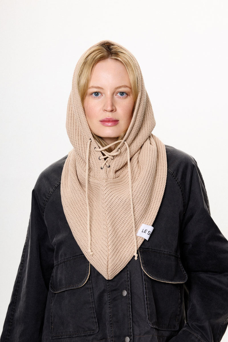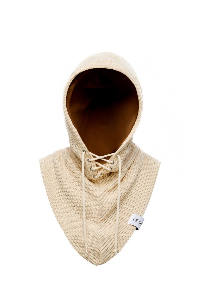- Model Beige Balaclava 1.0, hand-sewn beige balaclava, hood lined with fleece inside